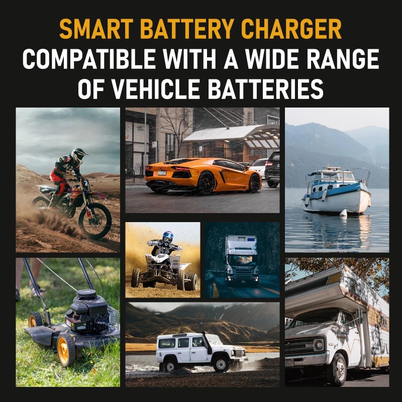MULTIPLE SAFETY PROTECTIONS - This battery trickle charger operates reliably in temperatures ranging from 14°F to 82°F and is equipped with multiple protection features, including smart controls, temperature compensation, under-charging prevention, reverse polarity protection, a cooling system, overcurrent protection, fireproof materials, overvoltage protection, and short-circuit prevention. You can charge your battery safely and reliably anytime, anywhere.