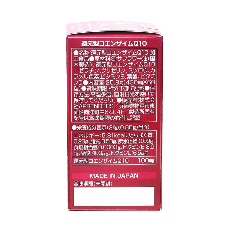 - 原材料 :サフラワー油(国内製造)、還元型コエンザイムQ10、ゼラチン、グリセリン、ミツロウ、カラメル色素、ビタミンE、葉酸、ビタミンD
