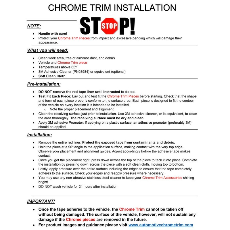 - High Quality Chrome Plated ABS Plastic - Imported. 3M Automotive-Grade Acrylic Foam tape will hold for a lifetime without causing any damage to the surface of the vehicle.
