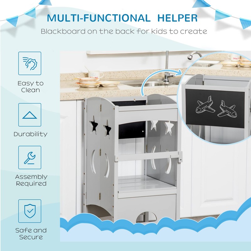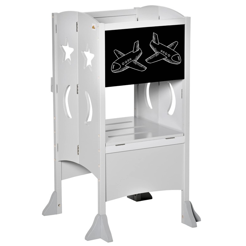 - Chalkboard: Featuring a chalkboard for drawing, this kitchen tower for toddlers has an activity integrated into its design. Let your child decorate their stool to make it more their own. The chalkboard is removable to allow the fun to be taken to a table.