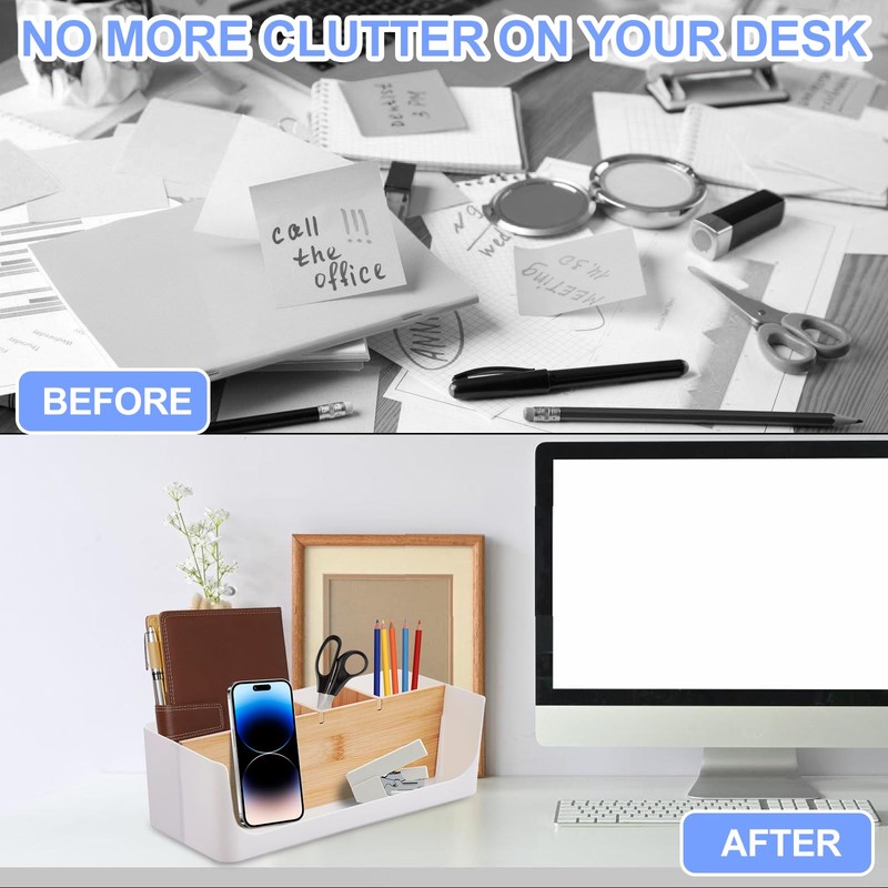- High-quality material: our desk organiser is made of thickened plastic, which is robust and wear-resistant, not easily deformed and can be used for a long time. Desk organiser has a beautiful appearance, smooth edges and no burrs, so you don't have to worry about scratching your hands. This office organiser does not need to be assembled and can organise your items neatly so you can easily access it