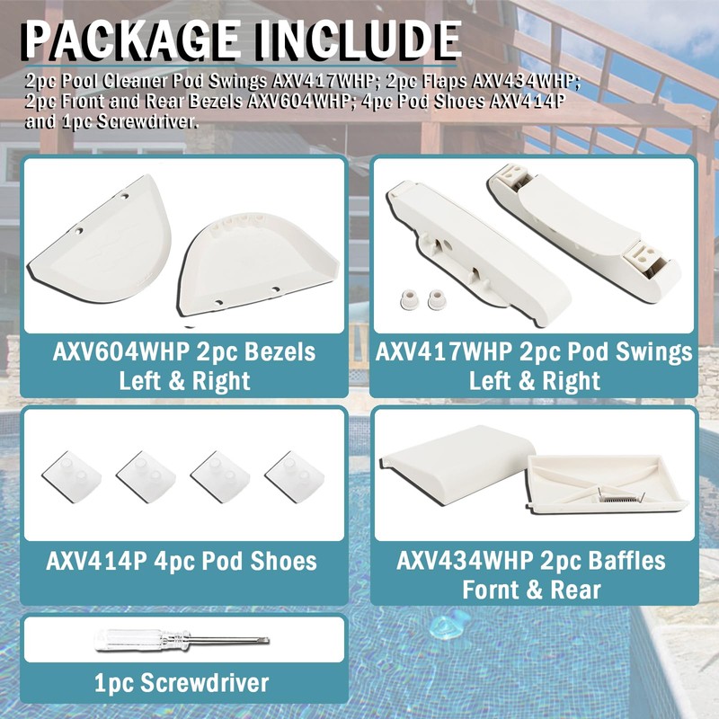 - 【Package】 2pc Pool Cleaner Pod Swings AXV417WHP; 2pc Flaps AXV434WHP; 2pc Front and Rear Bezels AXV604WHP; 4pc Pod Shoes AXV414P and 1pc Screwdriver.
