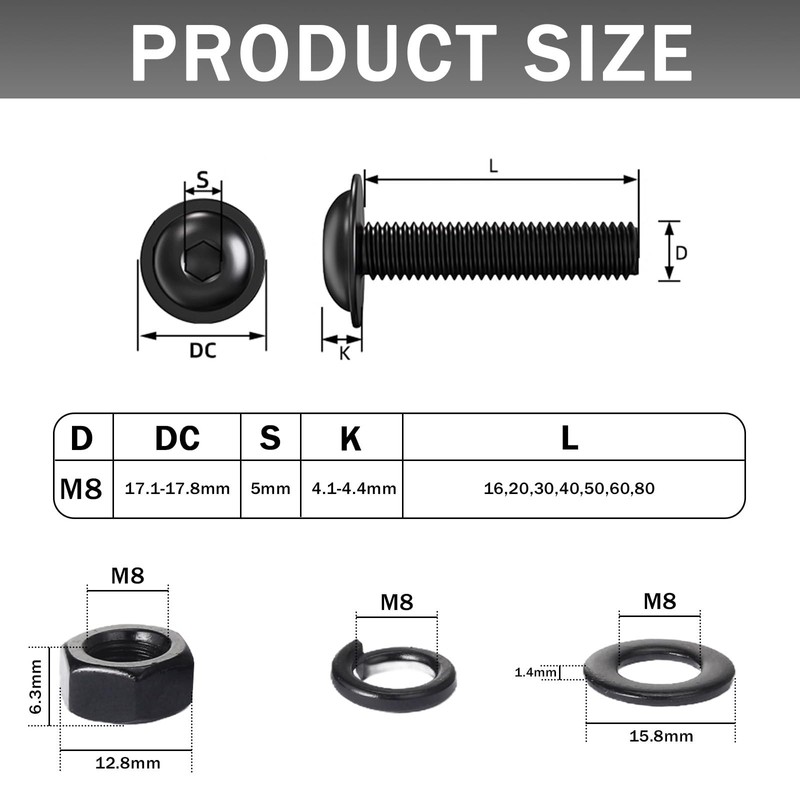 - Screws with Nuts:These button head socket screws come complete with matching nuts, flat washers, and spring lock washers. The flat washers increase the contact area for improved holding and clamping strength, while the spring washers provide tension and preload to maintain tight, stable connections during use.