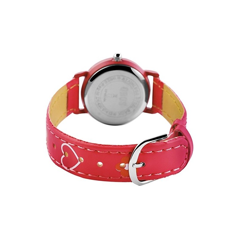 The analogue 3-hand children's watch from QBOS has a high-quality quartz movement. The red imitation leather bracelet is decorated with cute motifs such as hearts and flowers. It is 14 mm wide at the lug and can be opened and closed with a silver-coloured pin buckle. The total length of the watch is 21 cm. The red metal case with mineral glass has a diameter of 28 mm and a case height of 9 mm. The case back is made of stainless steel. The motifs of the bracelet are also reflected in the white dial. The Arabic numerals and the colour-coordinated hands in black make reading the time a breeze. The girly models help children learn the time in a joyful way and put a smile on the face of the little wearers.