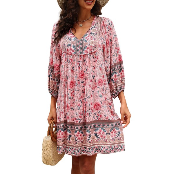 - Features: 3/4 balloon sleeves, v neck, tie neck, bohemian style, pretty floral print, loose waist, swing flowy A-Line hem, short length. Summer bohemian casual beach dress mini dress.