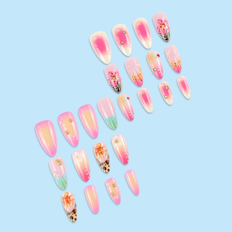 - 3D Flowers Artificial Nails Kit: The package contains 24 pieces of press on nails medium almond of different sizes, 1 nail file,1 wooden stick and 24 pieces of nail glue stickers.(Jelly glue doesn't last as long as liquid glue, but it can make fake nails reusable. Please use suitable glue according to different occasions)