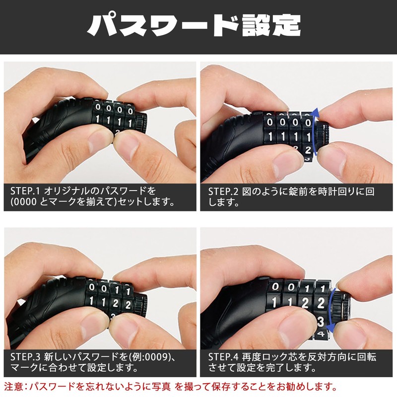 • 【パスワード設定方法】バイク ロック初期値のパスワードは:0000です。赤い領域がパスワード設定ポイントで、数字を回して設定します。初期パスワードでチェーンを開け、ロック上の矢印に従って回転させることでパスワードを再設定できます。設定後、反対方向に回転させて初期状態に戻すと完了です。