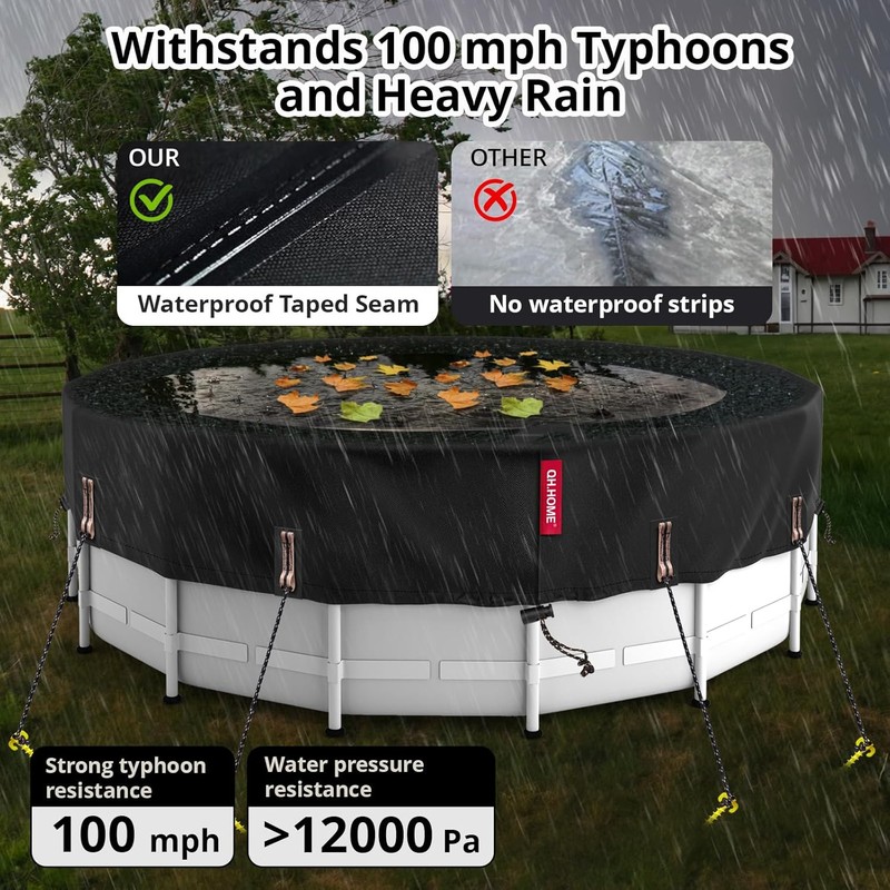 【ONE PIECE ANTI-TEAR DESIGN】QH.HOME 8ft round pool cover is made of upgraded oxford fabric with one-piece tear-resistant design around the edges (no risk of cracking around the edges compared to traditional double-stitched seams), which ensures the cover will be used for a long time.