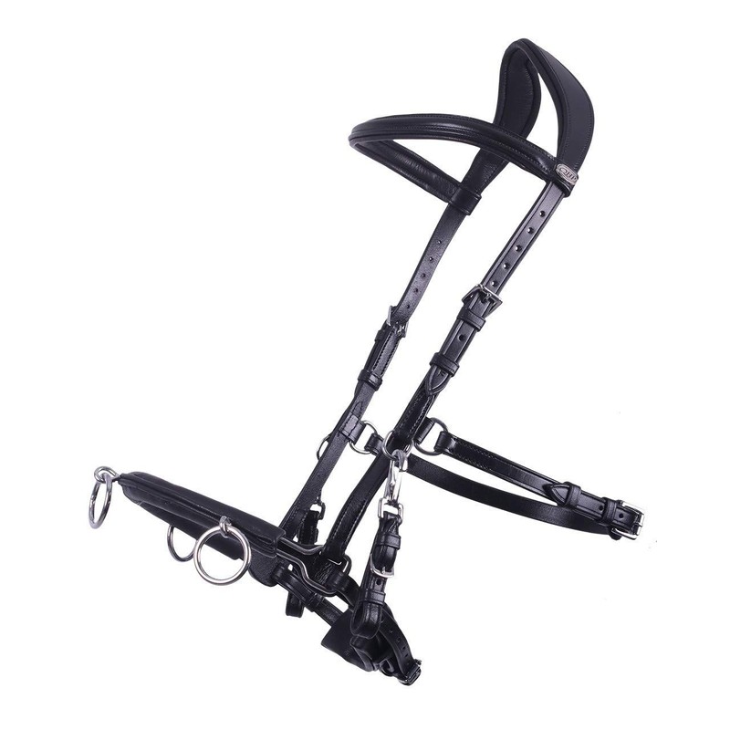 - Anatomically shaped headpiece. Leather padding under the closure of the noseband, headband and headpiece