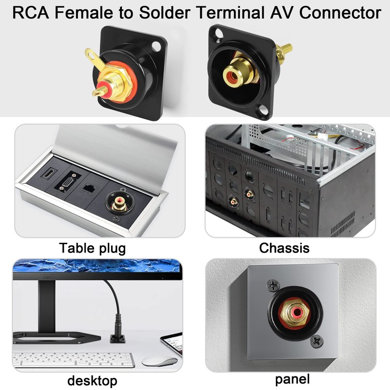- 【Panel Mount】Gold plated RCA Panel Mount Soldering adapter. Designed based on the mounting dimensions of a standard XLR panel / D-panel, it is a reinforced and easy to install connection system. Suitable for installation in equipment cabinets, equipment panels, walls, desktops, floor plugs etc.