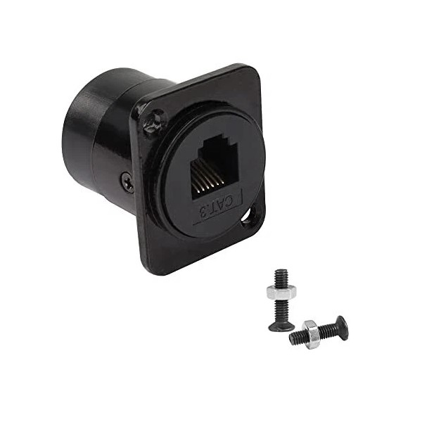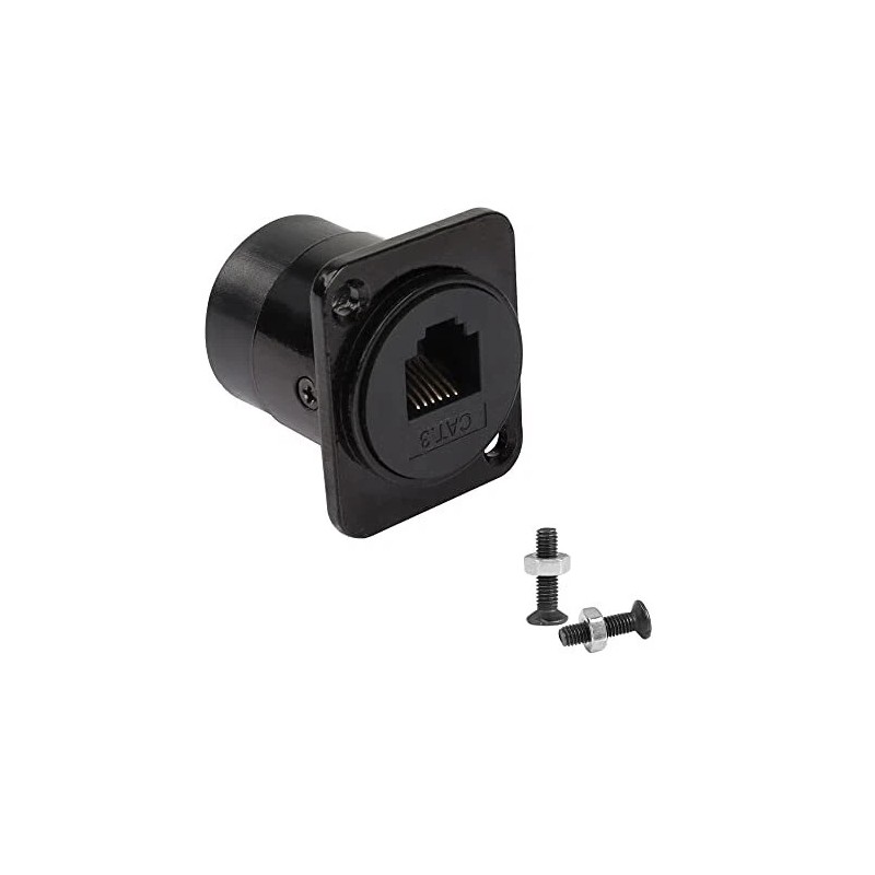 RJ11/RJ12 6P6C panel mount adapter, suitable for developing input/output configuration of custom telephone communication system, docking 6P6C/6P4C/6P2C cable to connect your communication system securely. Compatible with CAT 3 Ethernet cables, when used in combination, it ensures reliable transmission in telecommunications and networks. The installation size matches the XLR panel/D-type panel with 24mm opening. Suitable for fixing on walls, desktops, equipment panels, racks, etc. Zinc alloy die-cast housing ensures durability and meets special needs in harsh conditions such as factories or outdoors. Interface type: RJ11/RJ12 6P6C female Colour: Black Housing material: Zinc alloy. Size: 26*32*28 Package: 1 × RJ12 6P6C panel mount telephone line connector, 2 × M3*10 screws.