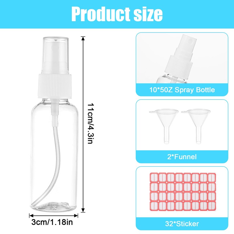 1. The package contains 10 50ml perfume refill bottles, 2 funnel and 1 32 sticky label. The number of hair water spray bottles is enough to meet your daily use and replacement.