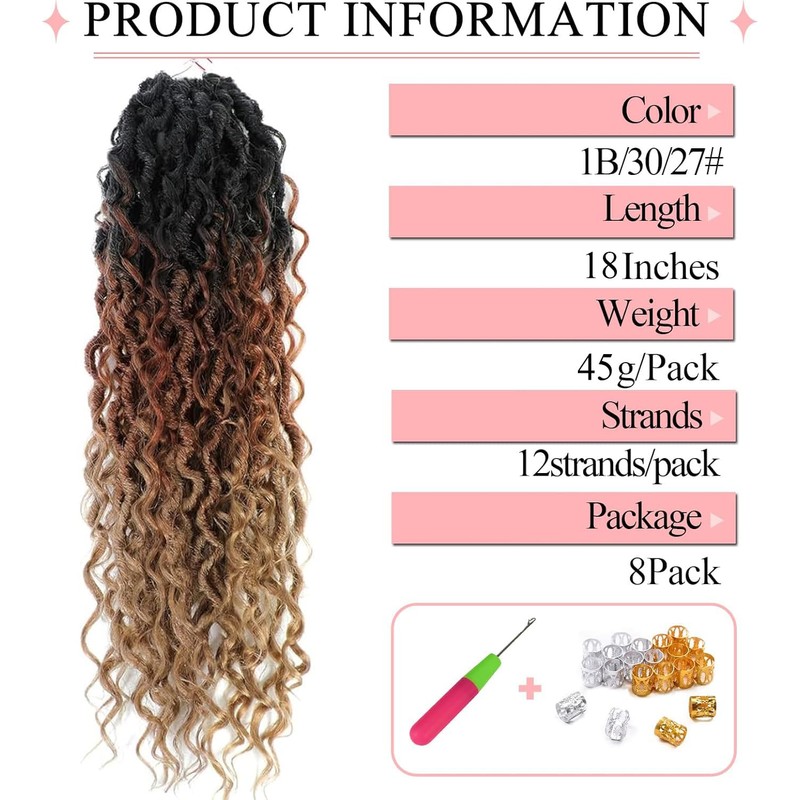 QIDESHENG 18" Goddess Locs Crochet Hair Extensions - 8 Packs Pre-Looped Faux Locs with Curls, Boho Braided Synthetic Hair for Black Women (1B/30/27, 18inch)
