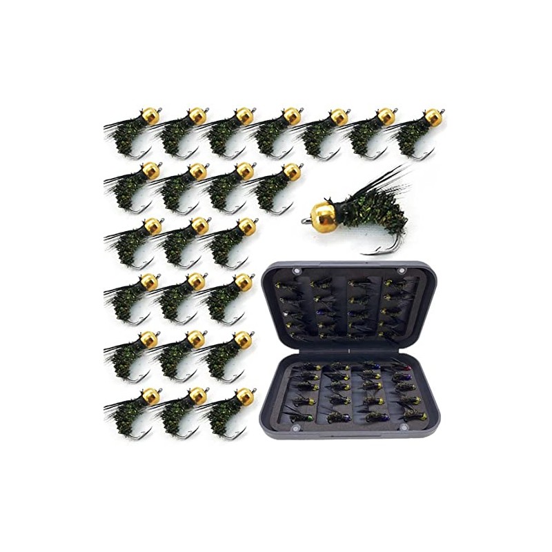 Qievcrme 24Pcs Fly Fishing Flies Trout Lures Fishing Tackle Fly Fishing Flies with Boxed Trout Bass Artificial Fish Bait (24Pcs-Brasshead Fly Black)