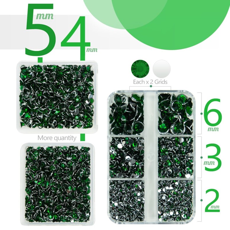 - ❤【3 Boxes Emerald Green Resin Crystal Rhinestones + Stainless Steel Tweezer + Pickup Pen】5070PCS Green flatback resin rhinestones are assorted in 5 sizes: 2mm 2700PCS / 3mm 820PCS / 4mm 920PCS / 5mm 550PCS / 6mm 80PCS. Dark Green flatback resin crystal rhinestones are very light and easy to carry, all gems are packed in each grid boxes according to different sizes, convenient to oragnize, no worry about rhinestones mixed together. Comes with 1 Tweezer and Pickup Pen for DIY Crafts.