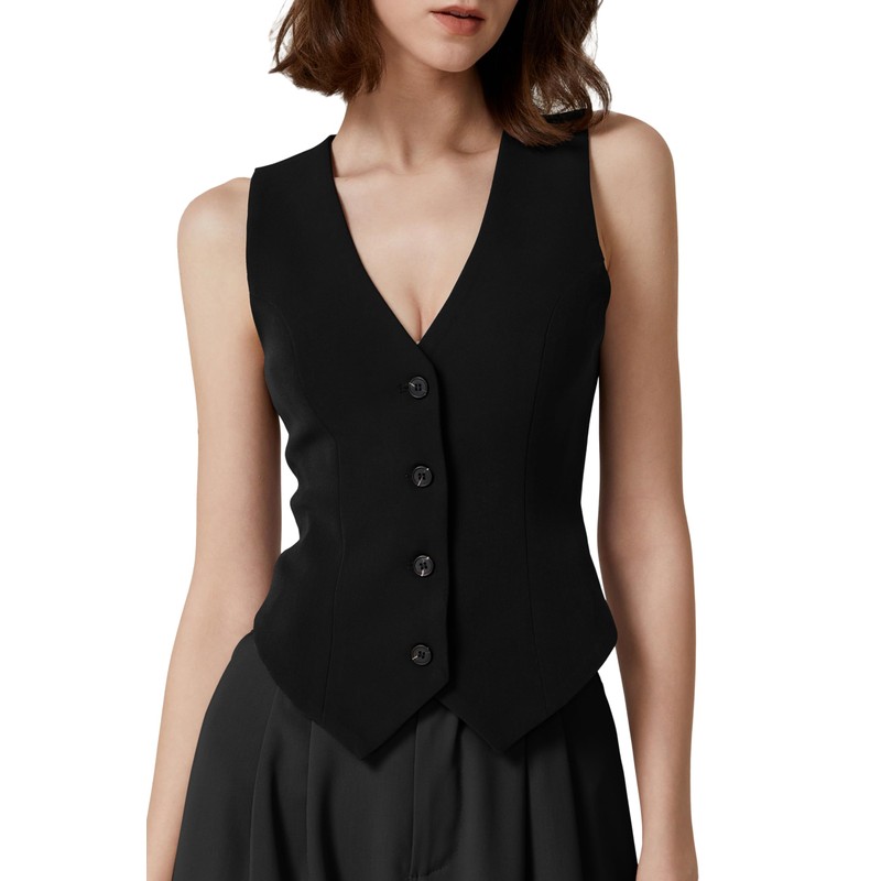 Featuring a stylish V-neck and sleeveless design, this vest is accented with elegant button details and distinctive stitching on both the front and back, flattering your figure and enhancing your silhouette.