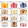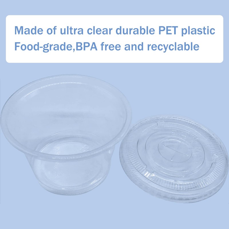 - Premium Material:The disposable plastic portion cups are made of ultra clear durable PET plastic.They are 100% food-grade,BPA free and recyclable.Safe for drinks and fruits.They are ideal for a variety of catering and carry applications in today's foodservice market.