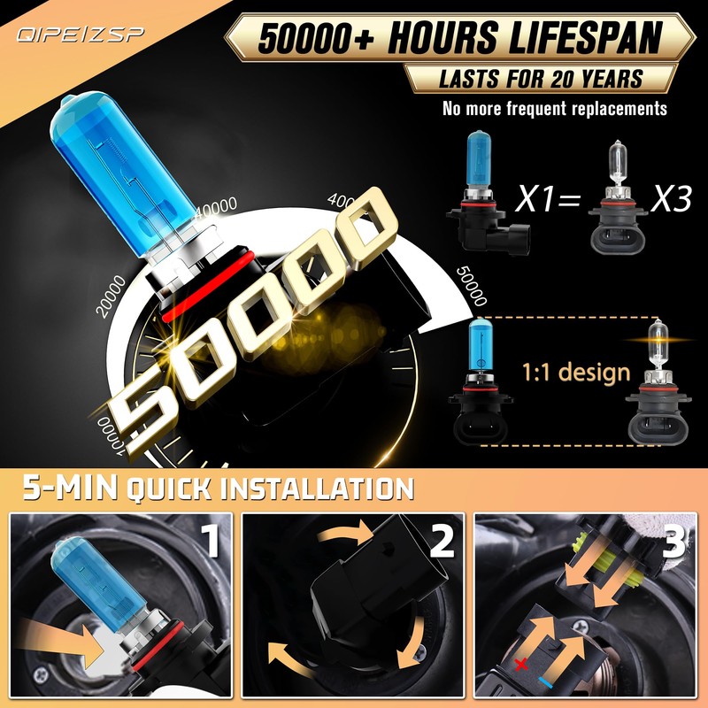 - 【Longevity Beyond 50,000 Hours】The low and high beam Halogen Bulb is filhalogen with Xenon gas, which helps helps to slow down the process of oxidizing the tungsten inside.QIPEIZSP Halogen bulbs lifespan can reach more than 50,000 hours. With IP68 waterproof dustproof design,our high/low beam Halogen bulb don't burn out or become damaged even in extreme weather,like fog/rain/overcast etc.