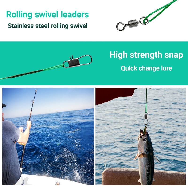 - Flexibility and Ease of Use: With a secure snap mechanism, attaching and detaching your fishing lines and lures has never been easier, saving you time and effort. Whether you're targeting big game fish in the ocean or freshwater species in rivers and lakes, our steel fishing leaders are designed to handle the challenge with ease.The smooth, high speed swivels ensure that your fishing line remains twist free, allowing your lure to move naturally and attract more fish.