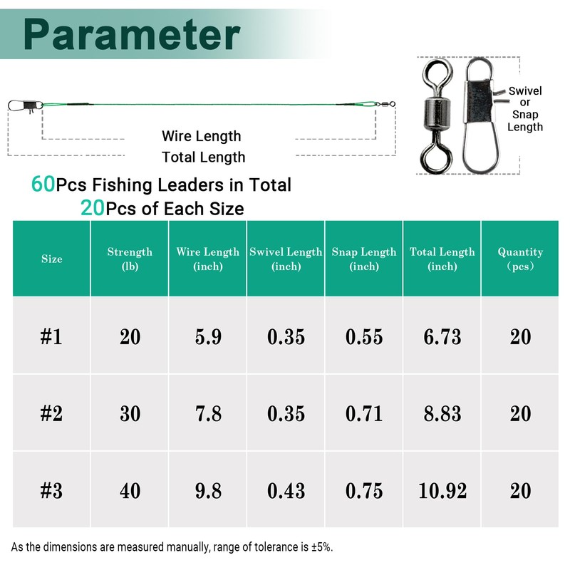 - Versatile Size Range: You will receive 60pcs stainless fishing leaders wire in 3 different sizes: 5. 9inch, 7. 8inch, 9. 8inch, 20pcs of each size.These steel fishing leaders are versatile, offering the ideal balance of strength and flexibility to enhance your fishing experience. Whether you're targeting small freshwater species or large saltwater predators, our steel fishing leaders wire offer the right strength and length for every scenario.