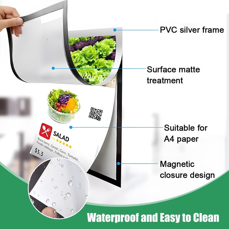 - Praktische Vielseitigkeit: Mit einer praktischen Infotasche für zusätzliche Details bieten diese Magnetrahmen eine ideale Lösung für Geschäftsinformationen, Angebote und Öffnungszeiten. Sie eignen sich sowohl für gewerbliche Anwendungen in Restaurants, Geschäften und Supermärkten als auch für den privaten Gebrauch zur Präsentation von Fotos und Kunstwerken.