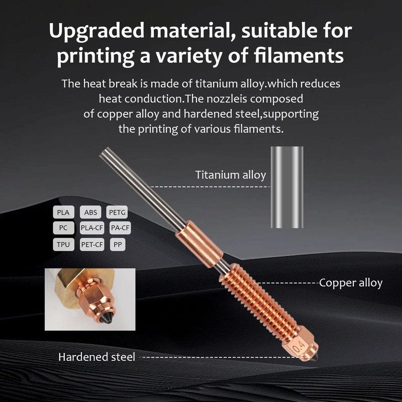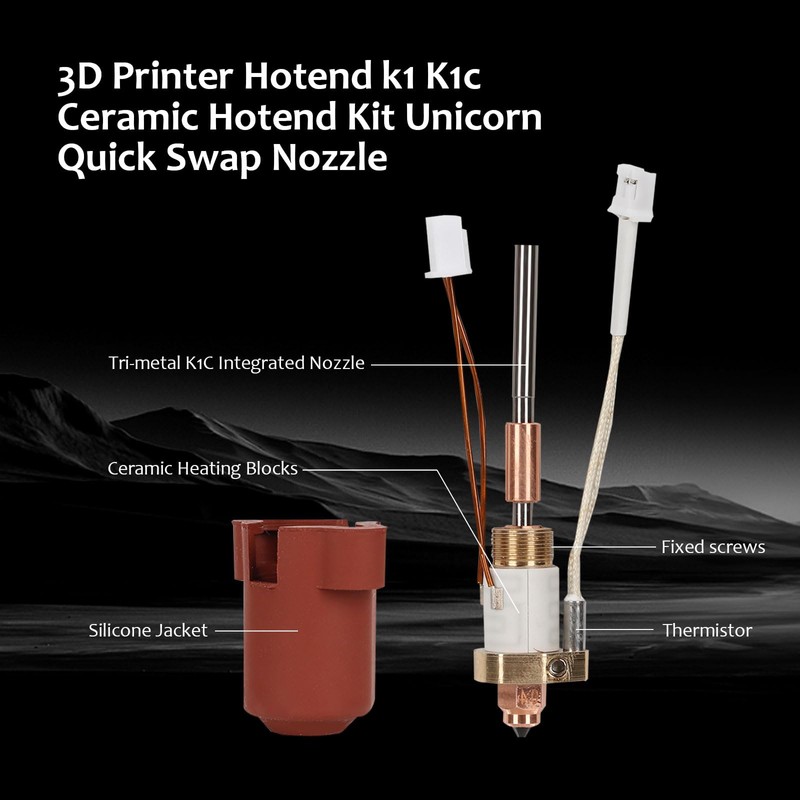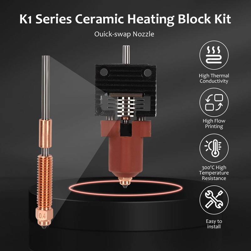 - Upgraded Durable Materials The ceramic heater block kit for the K1C K1 K1 K1 Max 3D printers is made of titanium alloy to minimize heat transfer, and is suitable for printing on various consumer goods such as PLA, ABS, PETG, TPU, PP, PC, PLA-CF, PA-CF, PET-CF, etc. The cooling part of the heating block is divided to reduce heat transfer; the surface is nickel plated to improve wear resistance and increase shine.