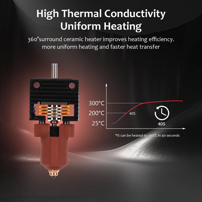 - 300 C HIGH TEMPERATURE RESISTANCE The upgraded heating block comes with a built-in quick change nozzle and is made of all-metal hot-end materials and is heat resistant. The improved heating block is equipped with a robust 60W ceramic heating ring with 360° environment, which can reach a temperature of 200°C in less than 40 seconds, improving the heating performance.