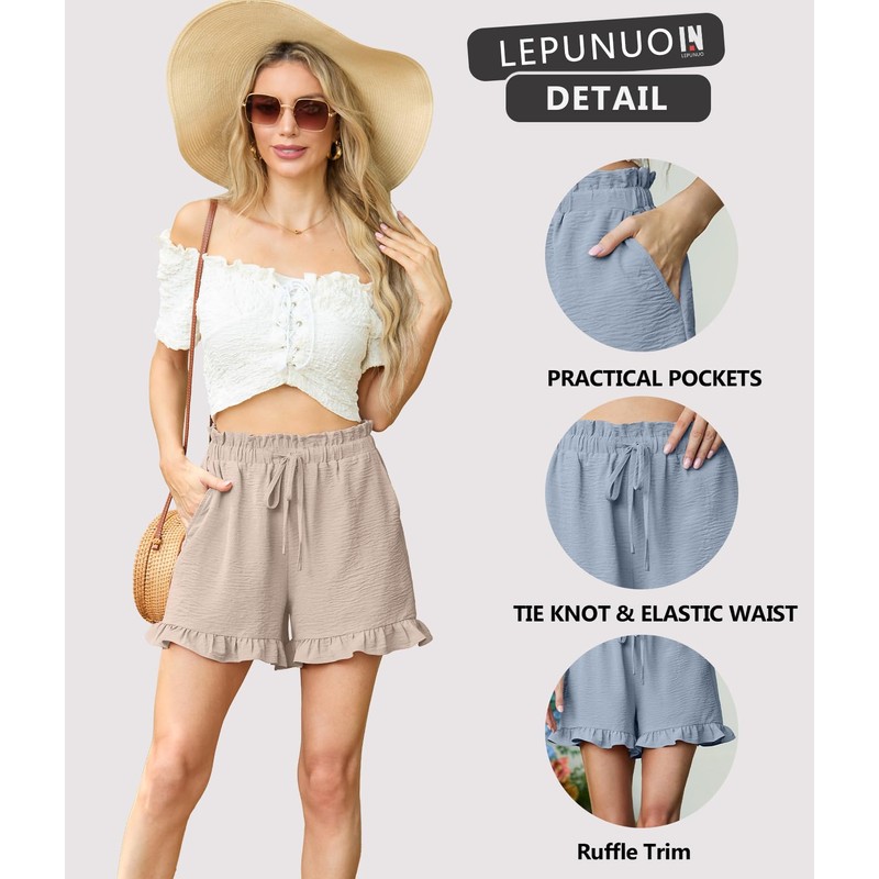 - Shorts womens Summer with fashionable pockets, elastic pleated waistband, and drawstring add more fashionable elements. Women loose wide leg shorts make summer cooler, and the wide leg ruffled hem accentuates your legs, making them appear slender and elongated.