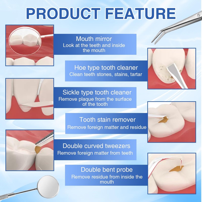 - Comprehensive Set for Oral Care: Our Dental Tools set includes 6 essential pieces: dental scaler, pick, mirror, curved needle, Dual Ended Gum Cleaner, and tweezers in a plastic box. Ergonomically designed for easy access to hard-to-reach areas, removing stains and plaque effectively