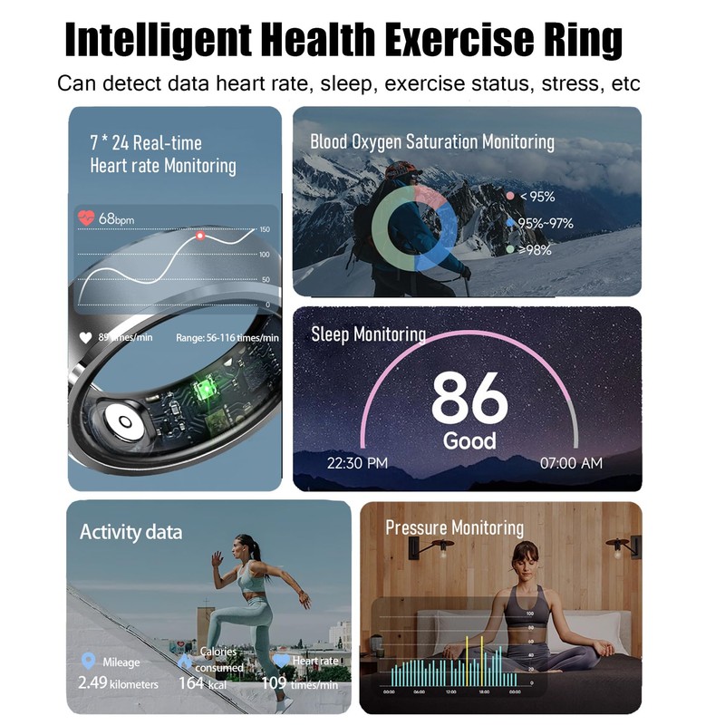 - 【Real-time Health Monitoring】The smart ring has the latest sensors that can track heart rate, Blood Pressure, blood oxygen, Women's Health and other data in real time 24 hours a day. It can also monitor sleep quality, record deep sleep, light sleep, eye movement and wakefulness. You can view all your reports on the APP
