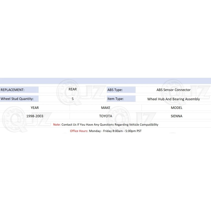 QJZ [1-Pack] 512041 REAR Wheel Bearing and Hub Assembly for 1998-2003 Toyota Sienna