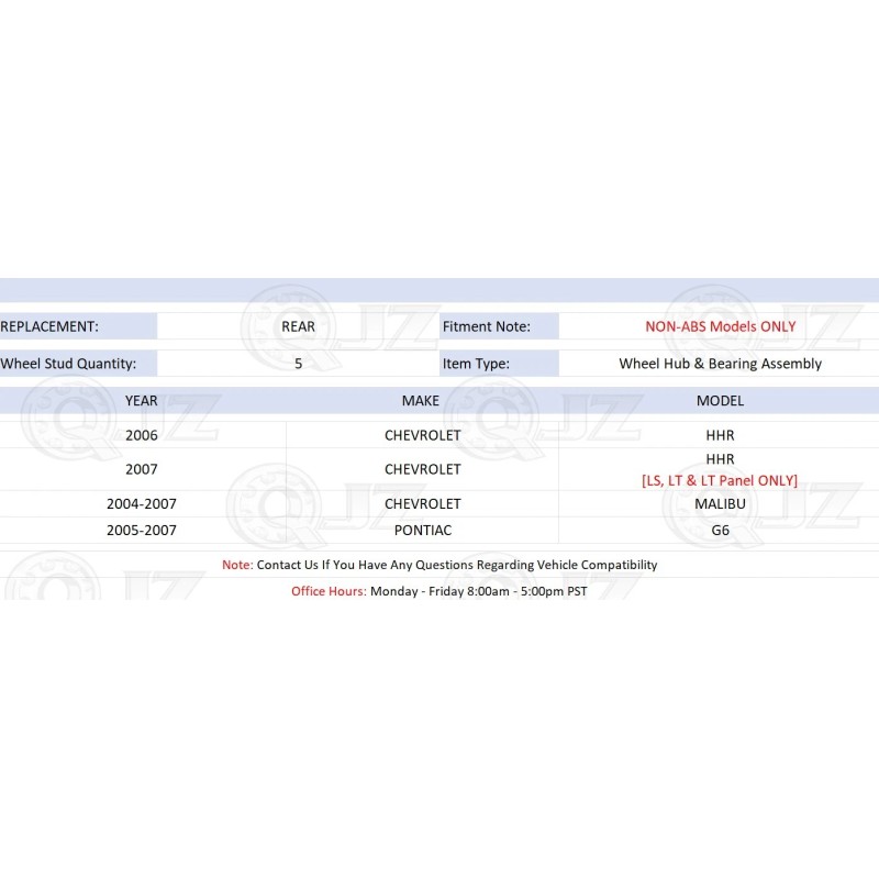 QJZ [1-Pack] 512287 REAR Wheel Bearing Hub Assembly for 2005-2007 Pontiac G6 Non-ABS