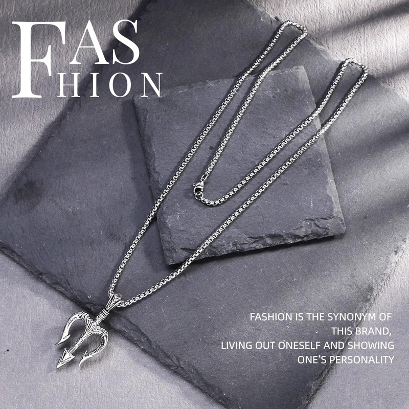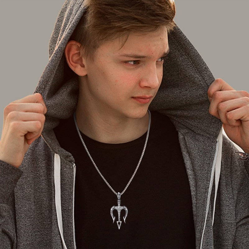 QKEOISUD Poseidon Trident Pendant Punk Necklace, Vintage Stainless Steel Rock Hip Hop Chain Ancient Greek Talisman Birthday Jewelry Men's Gift (Silver)