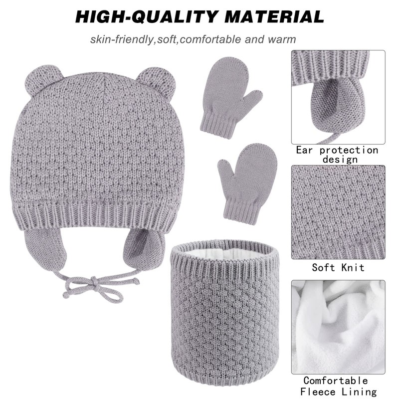 QKURT Children's Winter Warm Beanie Hats Snood Gloves Set, 3 in 1 Thick Fleece Thermal Toddler Hat Scarf Mittens Set Suitable for Boys and Girls Aged 1-3, gray
