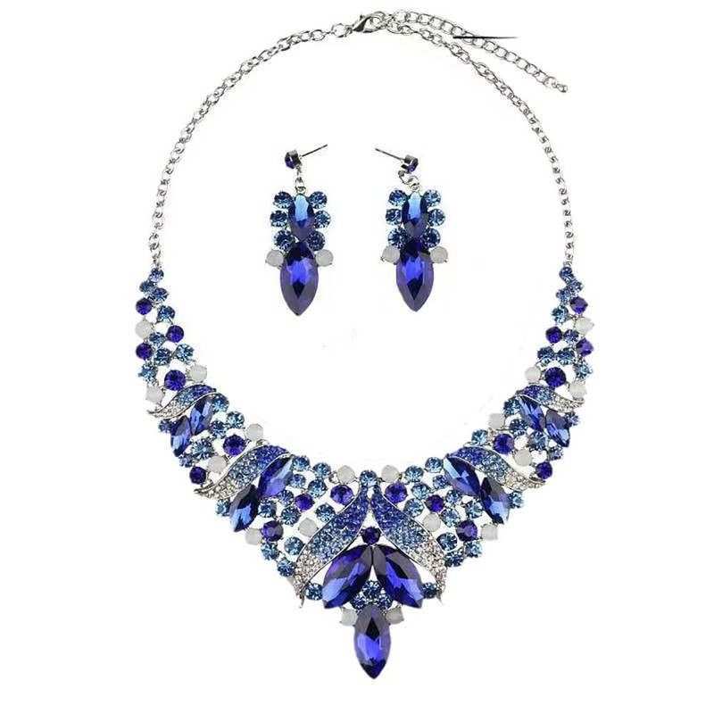 - Royal blue clear crystal rhnistone rib statement necklace earrings,with a fabulous design and solid construction.The classic and elegant always keep pace with fashion,which will make a timeless accessory to any jewelry collection. can be worn with classy casual with formal attire or Wedding dress ,never goes out of style.Adorned with selected Crystal, crafted with eco-friendly Zinc alloy, Lead-Free and Nickel-Free, this special design is born to match the clothes and your unique beauty