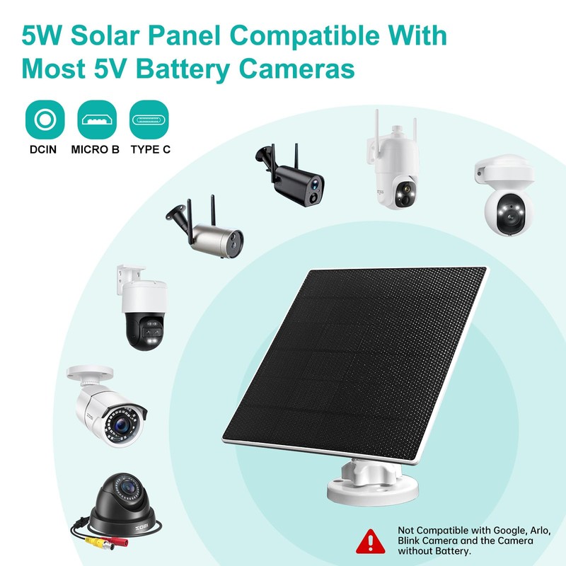 • Efficient Power for Ring Camera Solar Panel: Our 5W solar panel harnesses the sun's energy to power your outdoor cameras reliably. Made with monocrystalline silicon, it boasts high conversion rates for consistent power supply, even in low light. Eco-friendly and energy-efficient, it's Good for both home and business security.