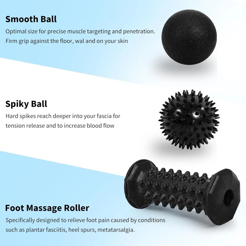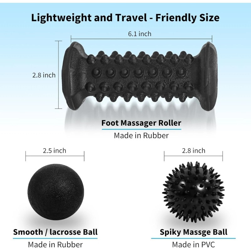 - Plantar Fasciitis Relief Massage Therapy Set:1 Foot Massager Roller,1 Massage Lacrosse Ball and 1 Spiky Ball. Comes with 3 different massagers to soothe muscle pain and soreness.