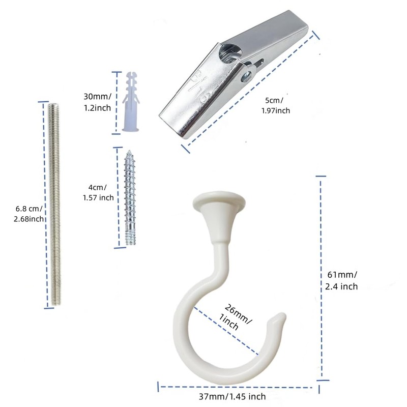- Swag ceiling hook Packing: 2 Set x Ceiling Swag Hooks + 2 Sets x Metal Pointed Screws + 2 Sets x Metal Bolts + 2 Sets x Spring Toggle Wing+ 2 Sets x Plastic Anchor