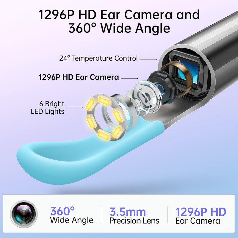 - 1296P HD Ear Wax Removal Tool Camera: The ear camera and 6 powerful LED lights provide superior clarity and illumination; Easily discover every nook and cranny of your ear canal with the 360 wide-angle lens and adjustable focus; You can obtain a comprehensive view of your ear, teeth, and other parts' condition