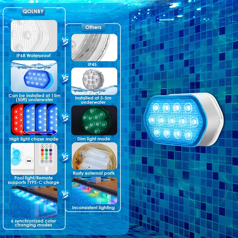 - IP68 Waterproof Integrated Design: Each underwater pool light adopts the new one-piece sealed design, unpacked and opened for immediate use, no need for tedious and complicated installation. QOLNBY pool lights are IP68 waterproof and can be completely safely submerged in water
