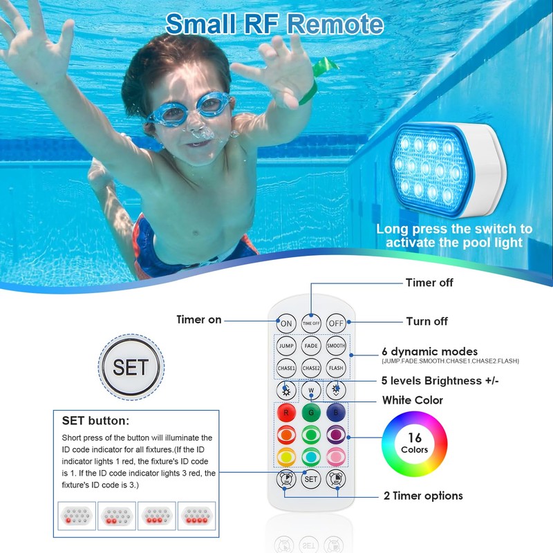 - Exclusive Rechargeable RF Remote Control: QOLNBY customized exclusive remote control for this pool light, which can be easily charged by universal USB-A to USB-C cable. Please long press the “ON” button for 5 s to turn on the remote control before first use, the top of the remote control will light up red when charging, light up green when fully charged. The pool LED light has 16 stable colors (white, red, green, blue, etc.), 6 color changing modes (JUMP,FADE,SMOOTH,CHASE1,CHASE2,FLASH) , 2 timer buttons (2hrs, 4hrs), 5 adjustable brightness levels, memory function