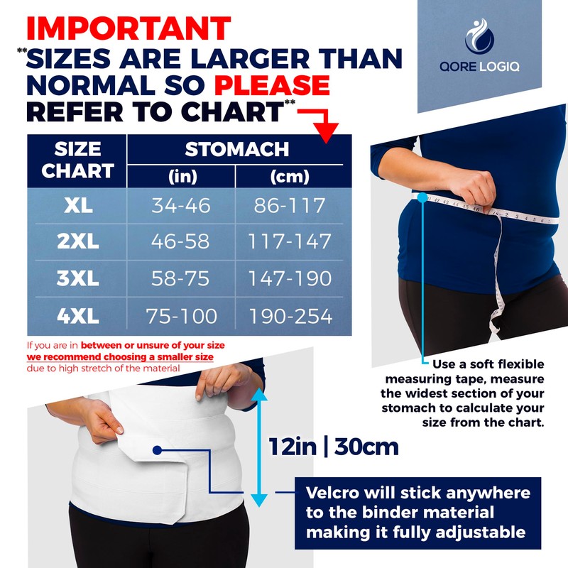 QORE LOGIQ Plus Size Abdominal Binder Post Surgery for larger Men + Women - Postpartum Belly Band - Compression Garment - Hernia Belt For Men + Woman - C Section Belly Binder - Adjustable (12 INCH