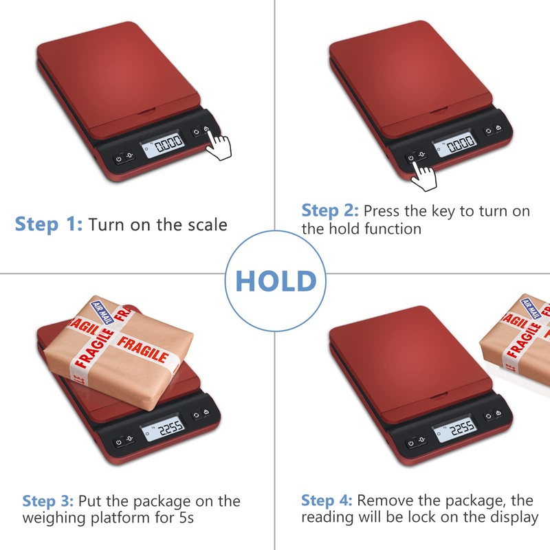 - HOLD & TARE FUNCTION: Hold function locks the weight, which is still displayed on the screen after the package is removed from the platform. Tare function zeroes out the container on the platform and only measures the contents of the container.