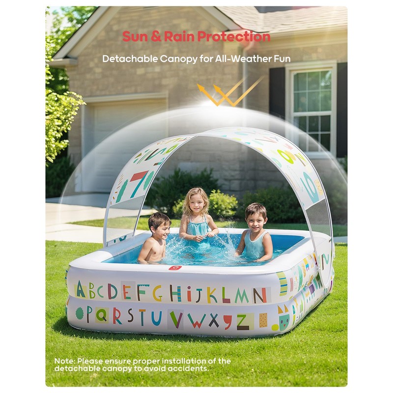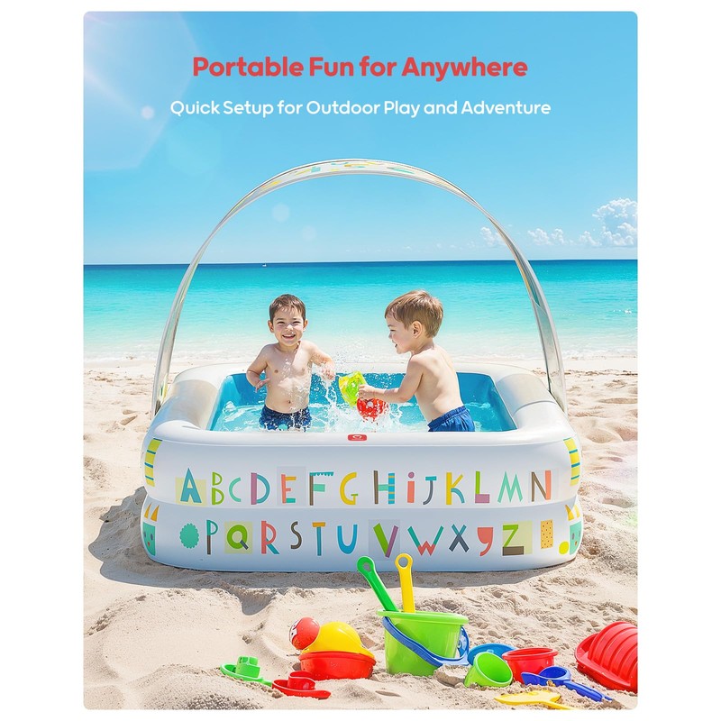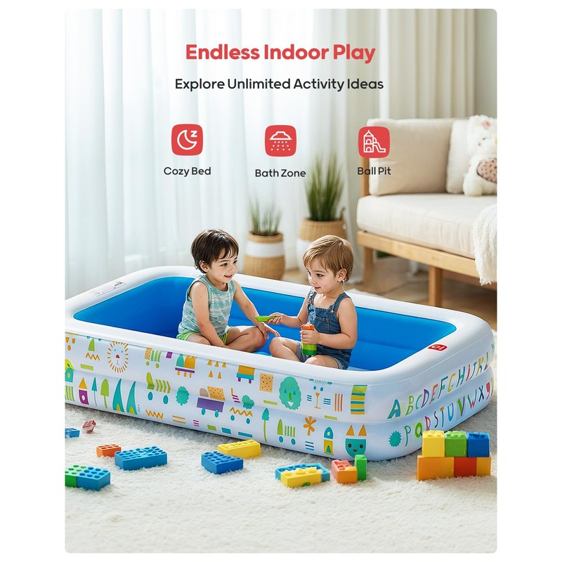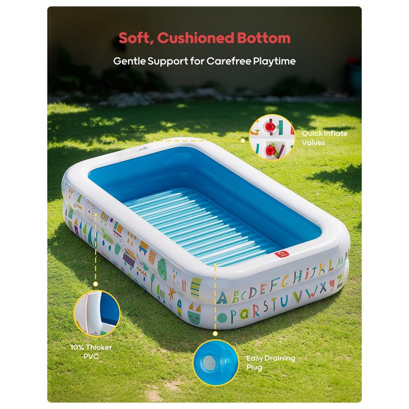 - Durable & Safe Materials – Crafted from 10% thicker, non-toxic PVC, this inflatable pool resists punctures and wear, ensuring a long-lasting and safe playtime experience. Built to withstand active toddlers, it's free from harmful chemicals, making it safe for children aged 1-6 years.