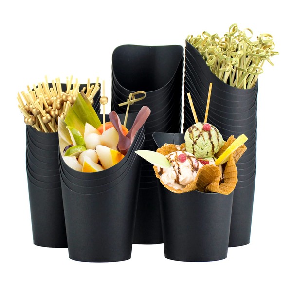 QPEY [50 cups + 100 picks 14OZ Black Charcuterie Cups with Cocktail Picks,French Fries Holder,French Fries Cones,Disposable Paper Appetizer Cups for all Occasions (black)