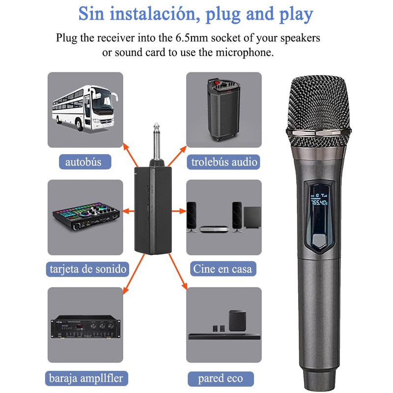 - 【Plug and Play and Multiple Compatibility】Conecte el receptor UHF a una toma de micrófono de 6.35 mm o 3.5 mm del equipo de audio. Compatible con dispositivos con 6.35mm (1/4") o 3.5mm (1/8") MIC interfaz, como altavoz de fiesta, máquina de cantar, amplificador, sistema PA, interfaz de audio, sistema de altavoces de camión, sistema de altavoces de cúpula y etc..