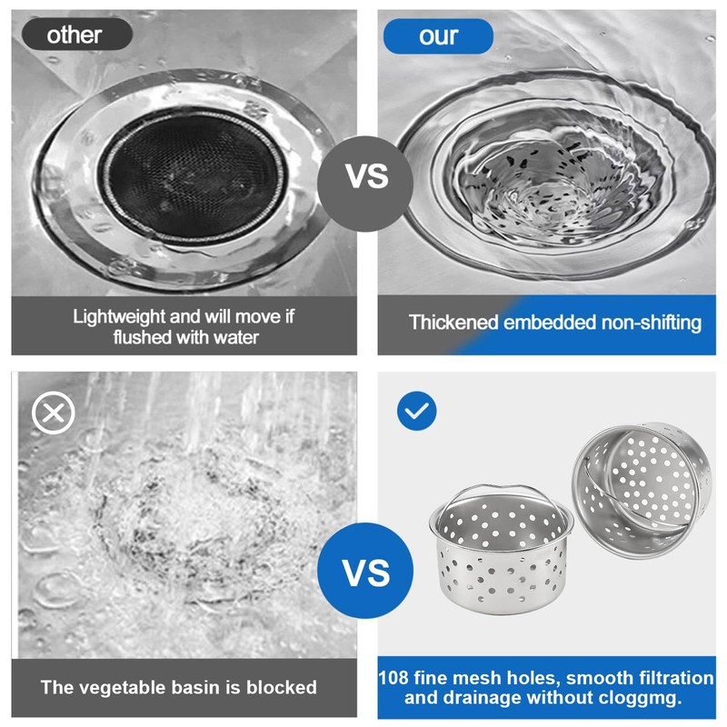 - 【108 Ultra-Dense Holes + Deep Design 】108 precision micro-holes and a deep 1.5" basket trap even tiny food scraps, coffee grounds, and debris while ensuring fast, smooth drainage – no more blocked pipes or messy cleanups!