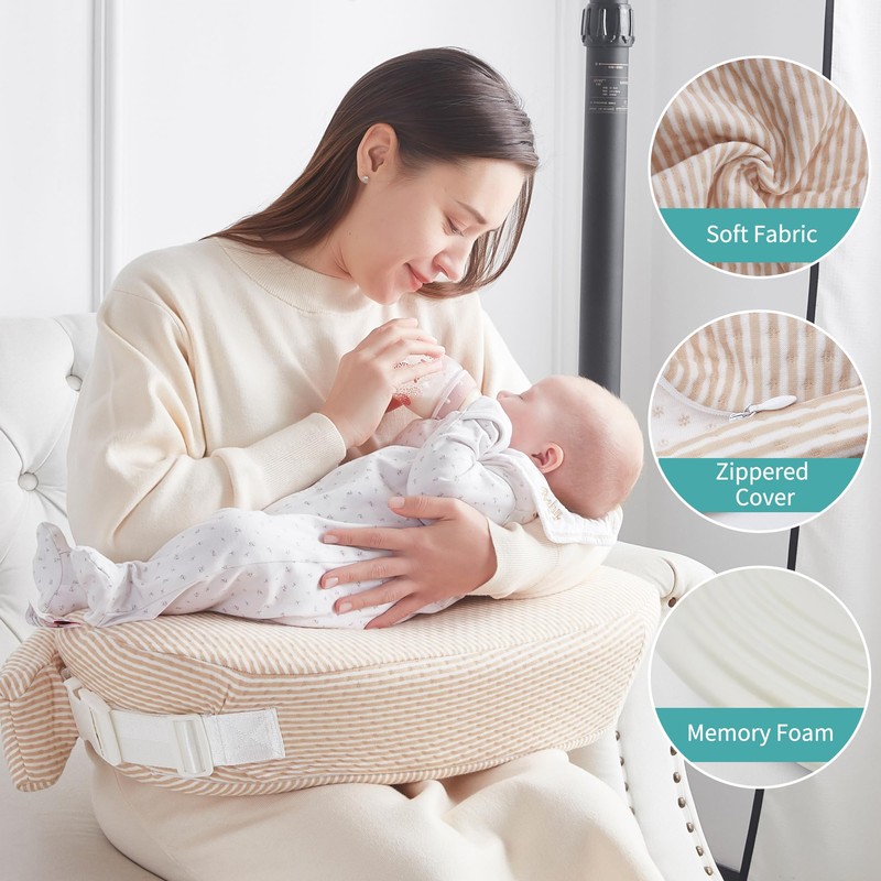 QSTEHEML Nursing Pillow Support for Mom and Baby Girl Boy, Large Essential Deluxe Nursing Pillow with Waterproof Lining Cover for Breastfeeding and Bottle Feeding, Memory Foam, Beige