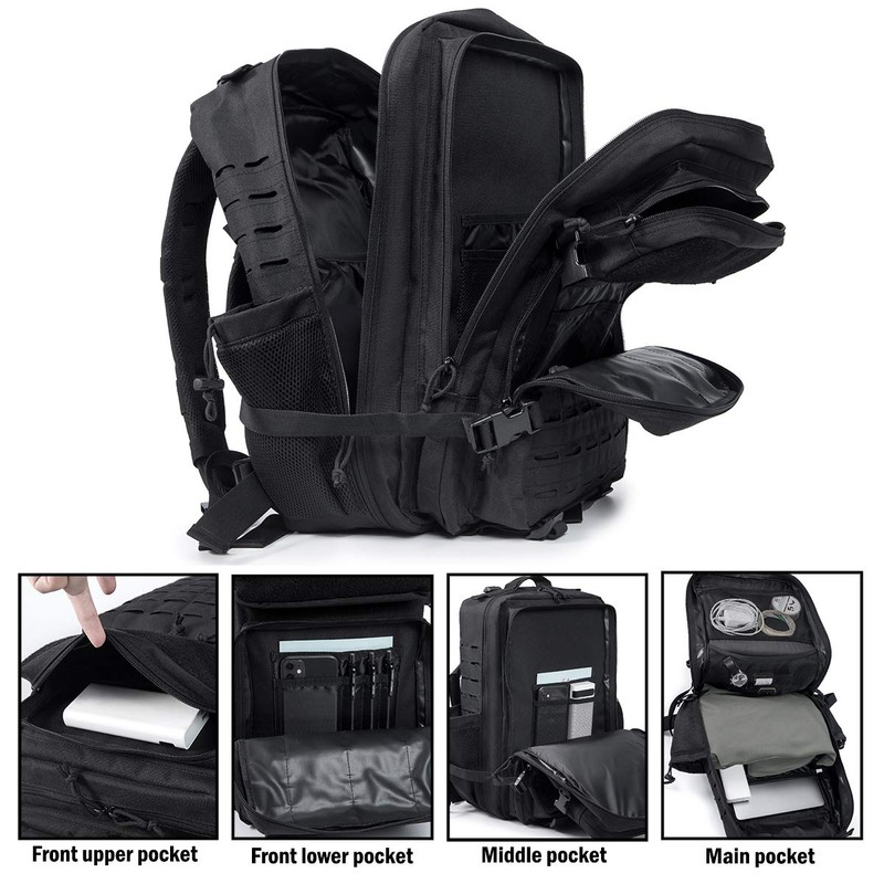 - ✅【MULTIPLE COMPARTMENTS】designed with 5 compartments for storing different stuff: two front pockets for small items, two large compartments with built-in zippered pocket and mesh pocket for big and important supplies, dedicated laptop/device compartment (17''), a hidden back pocket for frequently-used items, army military backpack opens flat to 180 degrees for easy packing/unpacking.Tactical backpack has bottle holder on both side of backpack, can fit for 750ml water bottle, umbrellas or tools.