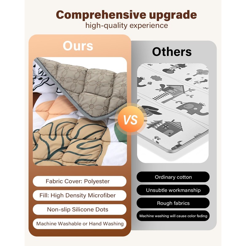 - 【Premium Soft Thicker Foam】 Our baby play mats for floor is 50% thicker than most other brands. And it's made of premium soft padding foam and fabric top layer to ensure a soft and cushioned surface, providing a comfortable place for your little one to relax, play and work on their developing skills.